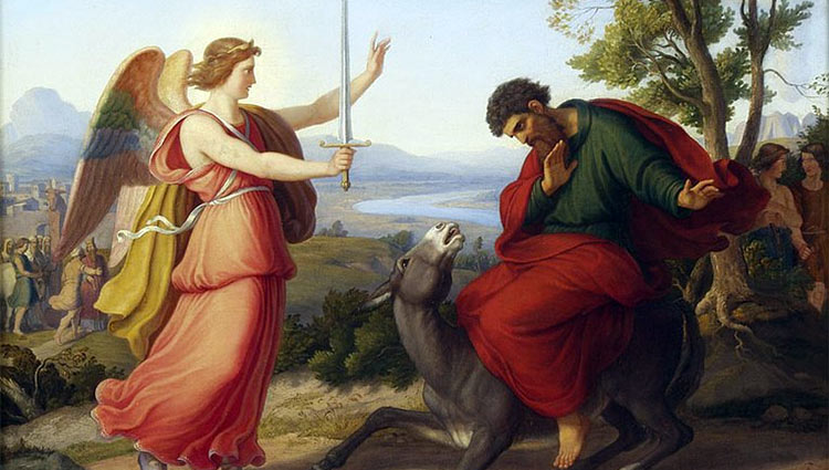 Le SEIGNEUR fit parler l’ânesse et elle dit à Balaam : « Que t’ai-je fait pour que tu me battes par trois fois? » – « C’est, lui dit Balaam, que tu en prends à ton aise avec moi! Si j’avais une épée en main, je te tuerais sur-le-champ! » L’ânesse dit à Balaam : « Ne suis-je pas ton ânesse, celle que tu montes depuis toujours? Est-ce mon habitude d’agir ainsi avec toi? » – « Non », dit-il. Le SEIGNEUR dessilla les yeux de Balaam, qui vit l’ange du SEIGNEUR posté sur le chemin, l’épée nue à la main; il s’inclina et se prosterna face contre terre. Alors l’ange du SEIGNEUR lui dit : « Pourquoi as-tu battu ton ânesse par trois fois? Tu le vois, c’est moi qui suis venu te barrer la route car, pour moi, c’est un voyage entrepris à la légère. L’ânesse m’a vu, elle, et par trois fois s’est écartée de moi. Si elle ne s’était pas écartée devant moi, je t’aurais tué sur-le-champ, tandis qu’à elle j’aurais laissé la vie sauve. » Balaam dit à l’ange du SEIGNEUR : « J’ai péché, car je n’ai pas reconnu que c’était toi qui étais posté là, devant moi, sur le chemin. Maintenant si ce voyage te déplaît, je m’en retournerai. » (Nombres 22,21-34)