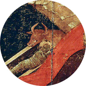 Le bœuf a été et est encore, pour certaines civilisations, un animal sacré ; il est souvent immolé, offert en sacrifice. C’est un animal fort, courageux et calme. Il était symbole de richesse. Pour citer une prophétie de l’Ancien Testament dans son chapitre sur le signe de l’Emmanuel, Ésaïe écrit : « Quant à toutes les montagnes […] ce sera un pâturage de bœufs et un pacage de moutons » (Es 7,25), ce qui nous semble être exactement le paysage de l’icône.